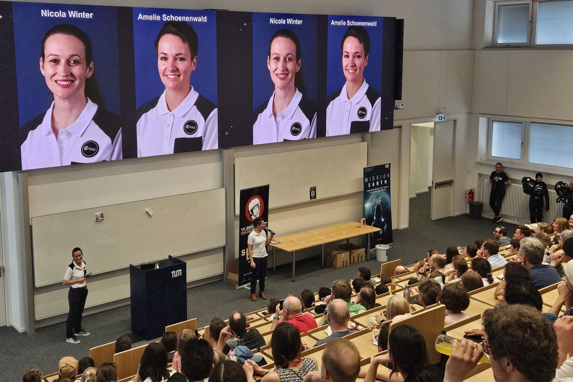 Höhepunkt der Veranstaltung war der Vortrag der Astronautinnen Nicola Winter und TUM-Alumna Dr. Amelie Schönenwald, deren Erfahrungen Einblicke in die Herausforderungen der Raumfahrt boten. Mit beeindruckenden Anekdoten und aus erster Hand und Erfahrungen aus dem Leben jenseits der Erdatmosphäre nahmen sie das Publikum auf eine Reise durch die Weiten des Weltraums mit.