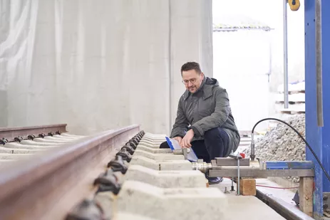 Auch das zum Lehrstuhl gehörende Prüfamt für Verkehrswegebau bildet eine wichtige Schnittstelle von Academia und industrieller Anwendung. Mitarbeitende und Forschende führen hier Labor- sowie Feldversuche durch, um einzelne Komponenten oder ganze Systeme zu entwickeln und zu überprüfen. Leiter Freudenstein unterstreicht die Bedeutung des Prüfamtes: „Es ist neben dem Team an Mitarbeitenden das Wertvollste, das wir haben, weil es eine konkrete, kontinuierliche Verbindung herstellt: Von der Theorie über die Laborprüfungen bis hin zu den Feldmessungen im Gleis.“ Dabei agiert die TUM-Einrichtung unabhängig von Unternehmen, sie entscheidet neutral über Trends, Sicherheit und Zulassungspotential. Nach jeder Untersuchung stellt das Prüfamt offiziell anerkannte Forschungsberichte aus, die Unternehmen – im Falle einer positiven Beurteilung – auch bei der jeweiligen Zulassungsbehörde, z.B. beim Eisenbahnbundesamt, einreichen können.