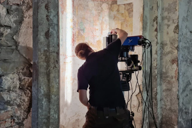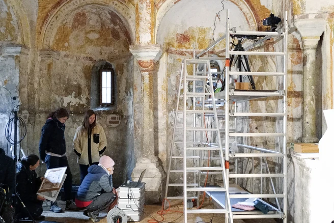 Im Zentrum standen die komplexen Malereien aus dem 12. bis 17. Jahrhundert, die vor Ort detailliert analysiert wurden. Zwischen 2023 und 2025 fanden dazu sechs Analysekampagnen in der Kapelle statt. Die naturwissenschaftlichen Analysen wurden von Dr. Clarimma Sessa (Leiterin des insiTUMlab), Postdoktorandin Dr. Eva Mariasole Angelin und Doktorand Simon Mindermann durchgeführt. Doktorandin Nadia Thalguter begleitete die Kampagnen als Restauratorin für Wandmalerei. Ihre Expertise war entscheidend für die Befundinterpretation und die Einordnung der technologischen Daten in den kunsthistorischen Kontext.
