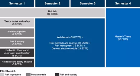 - Wahlblöcke: Risikomethoden und -analyse, Risiko-Management, Allgemeine Wahlmodule