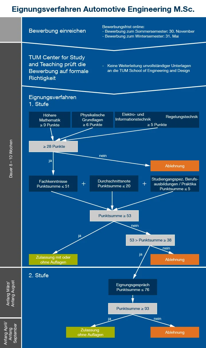 Mindestvoraussetzungen für ein Masterstudium an der TUM sind ein erster anerkannter Hochschulabschluss (z.B. Bachelor) sowie das erfolgreiche Durchlaufen eines Eignungsverfahrens. In diesem prüft die TUM School of Engineering and Design Ihre individuelle Begabung und Motivation.