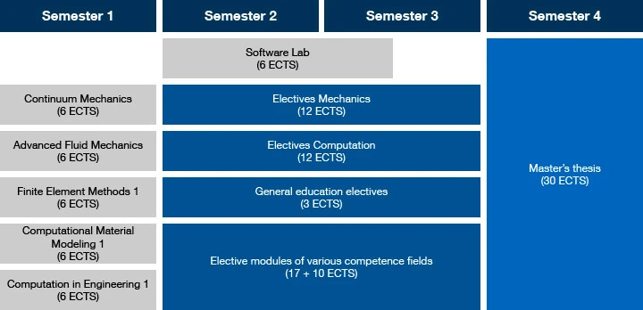 Da unsere Studierenden aus verschiedenen technischen Bereichen kommen, umfasst das erste Semester Pflichtfächer, die sich mit grundlegenden Themen der verschiedenen Disziplinen befassen: Strukturmechanik und -analyse, Strömungsmechanik, Computational Mechanics und Computation in Engineering. Darüber hinaus erhalten Sie in einer Einführungswoche eine maßgeschneiderte Einführung in die Programmiersprache C++.