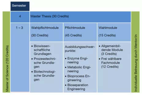 Beginnend im 2. und auch im 3. Semester werden diese Grundlagen durch eine fachspezifische Ausbildung in den Schwerpunktgebieten Enzyme Engineering, Metabolic Engineering, Bioprocess Engineering und Bioseparation Engineering ergänzt.