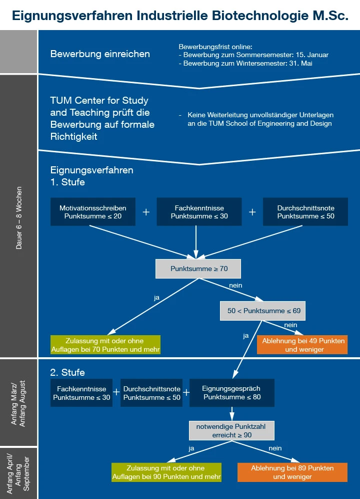 - einen an einer in- oder ausländischen Hochschule erworbenen qualifizierten mindestens sechssemestrigen Bachelorabschluss (Bachelor of Science) oder einen mindestens gleichwertigen Abschluss in den Studiengängen Biochemie, (Molekulare) Biotechnologie, Biologie, Bioprozesstechnik, Chemie-Ingenieurwesen, Energie- und Prozesstechnik, Engineering Sciences, chemische Biotechnologie oder vergleichbaren Studiengängen.