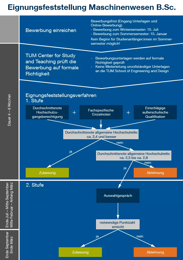 → Alle, die das Abitur mit einer Gesamtnote von ca. 2,5 bis ca. 2,8 (Richtwerte) bestanden haben, werden zu einem Auswahlgespräch eingeladen. Im Rahmen dieses Gesprächs haben die Kandidatinnen und Kandidaten die Möglichkeit, ihre Gesprächspartnerinnen und -partner von ihrer Eignung für das Maschinenwesen-Studium zu überzeugen.