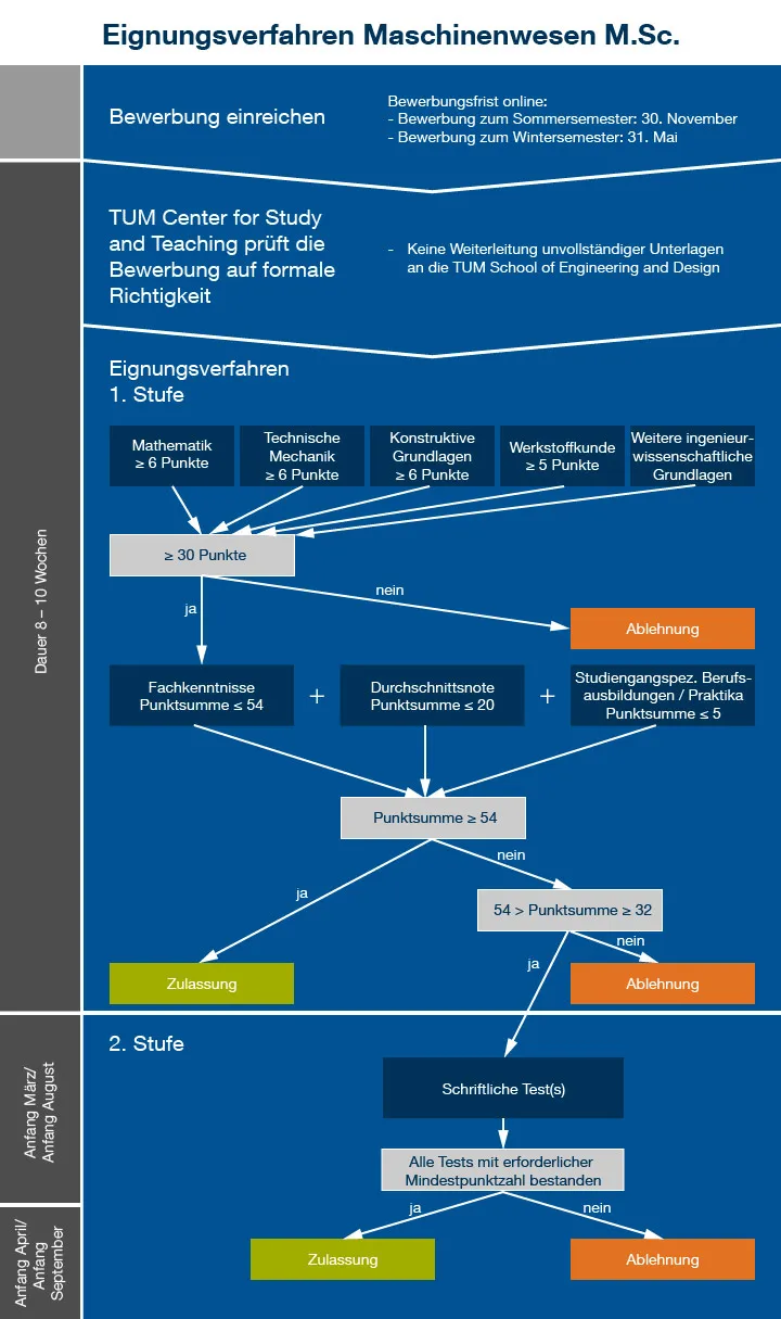 Mindestvoraussetzungen für ein Masterstudium an der TUM sind ein erster anerkannter Hochschulabschluss (z.B. Bachelor) sowie das erfolgreiche Durchlaufen eines Eignungsverfahrens. In diesem prüft die TUM School of Engineering and Design Ihre individuelle Begabung und Motivation.