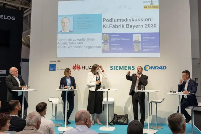 Last year in June, the KI.Fabrik project celebrated its launch together with high-ranking representatives from politics, science and industry. One year later, selected project partners very successfully presented themselves with eight demos to a broad national and international trade audience for four days at automatica, the world's leading trade fair for automation and robotics. In partially interactive demos, visitors were able to experience first-hand AI-supported multi-robot cooperation, teleoperation (operating a robot over a long distance), collective learning of multiple robots for accelerated task execution, impedance-based control of robot forces, and human motion detection for transmission to mechanical colleagues. Among the most prominent visitors to the exhibition area organized by the Munich Institute of Robotics and Machine Intelligence (MIRMI) were Bavarian Prime Minister Dr. Markus Söder, as well as Markus Blume, Minister of Science and the Arts, and Minister Hubert Aiwanger, State Ministry of Economic Affairs, Regional Development and Energy. The latter took part in the panel discussion "AI.Fabrik - guarantor for secure jobs and sustainable value chains", which was moderated by Prof. Birgit Vogel-Heuser. Together with Carolin Richter (BMW), Peter Krumbholz (Linde Material Handling) and Prof. Klaus Bengler (TUM), the minister discussed topics such as technology leadership and AI in the workplace, among others, in front of a broad audience and was then still guided - visibly impressed - to selected booths. The general opinion was that the appropriate technologies are crucial for the strategic use of human technology cooperation in crafts, production and logistics against the backdrop of demographic change.