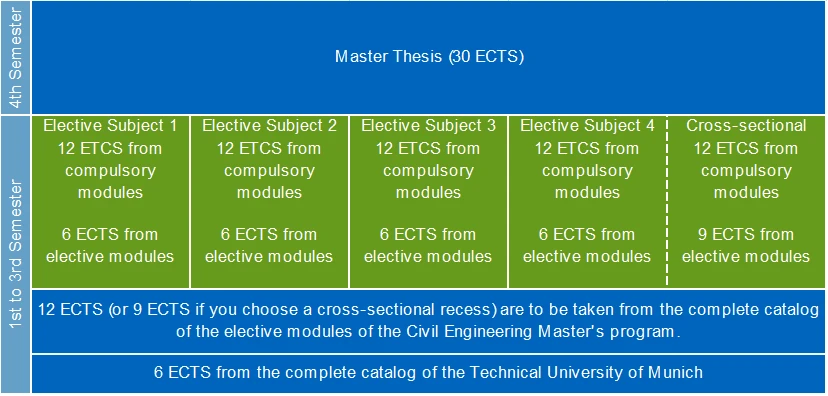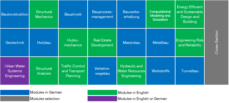 Your bachelor's degree must have a minimum duration of three years and provide you with the prerequisites necessary to succeed in advanced civil engineering classes. These are mostly studies in Environmental Engineering, Civil Engineering or equivalent engineering disciplines. The fitness of the bachelor’s degree is evaluated based on the following course groups and weighted according to the credits of these groups in TUM’s civil engineering bachelor’s program: