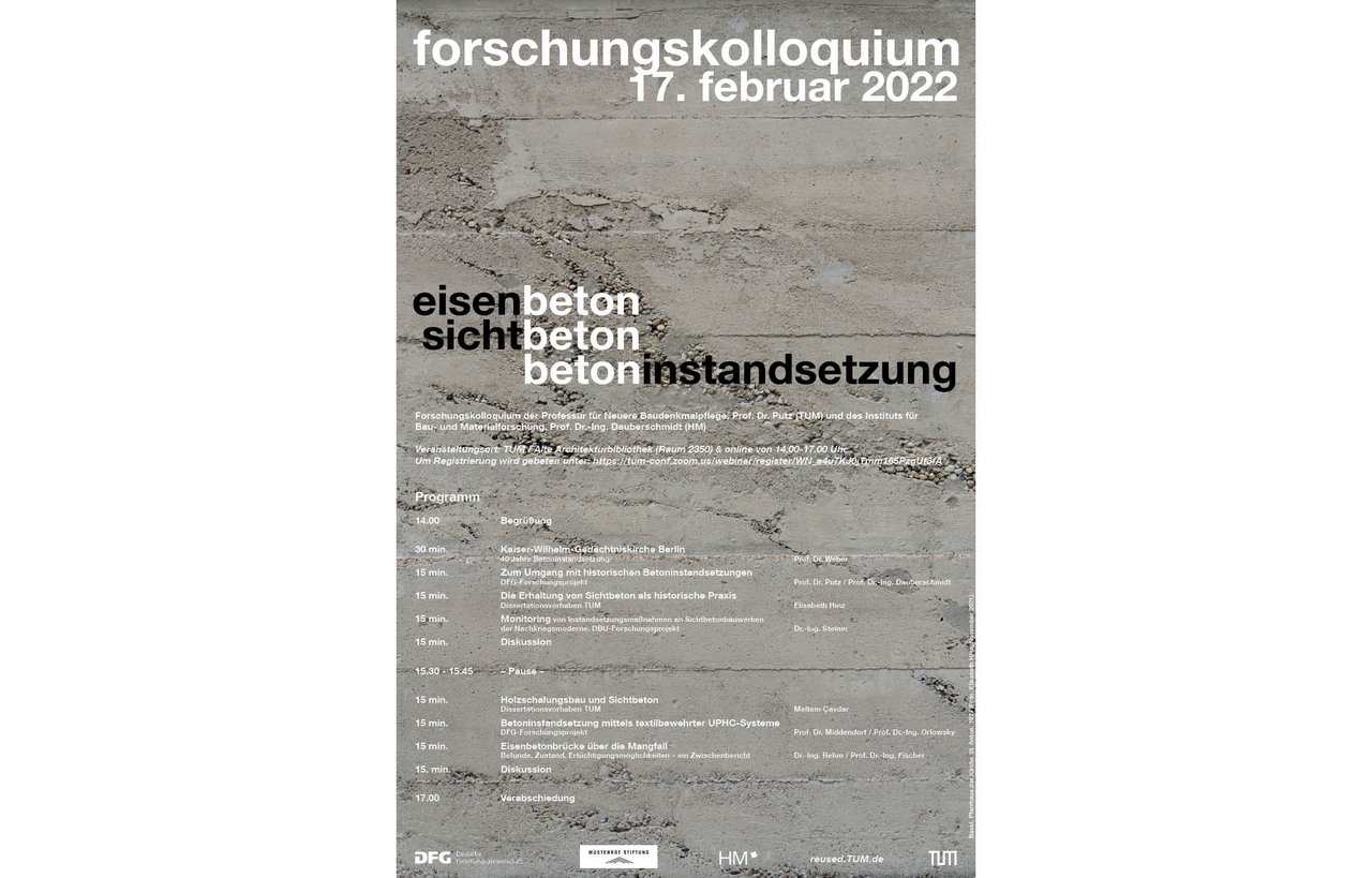 Forschungskolloquium der Professur für Neuere Baudenkmalpflege, Prof. Dr. Putz (TUM) und des Instituts für Bau- und Materialforschung, Prof. Dr.-Ing. Dauberschmidt (HM). Das Kolloquium findet im Rahmen des SPP 2255 Kulturerbe Konstruktion statt.